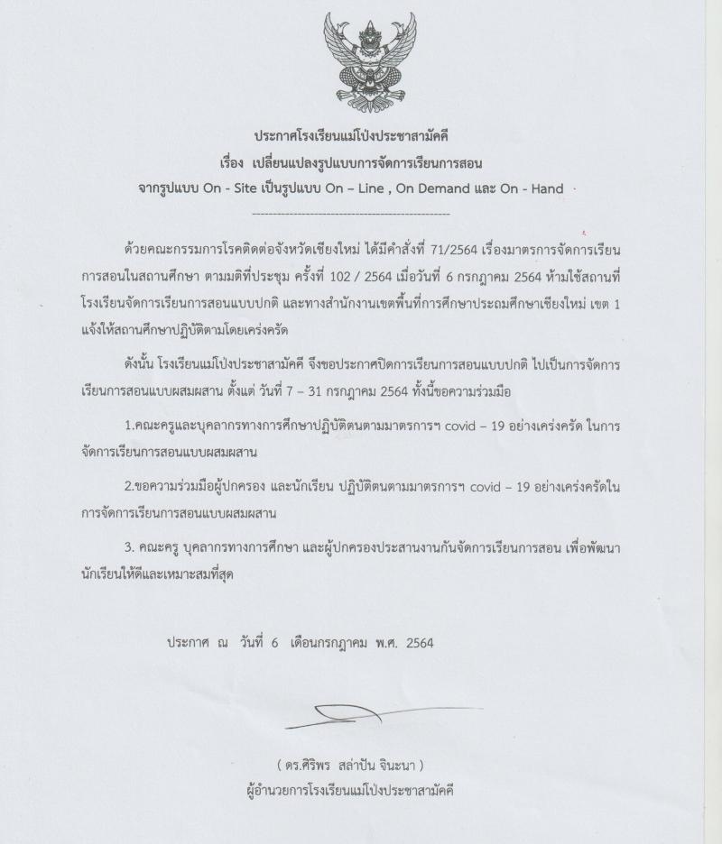 ประกาศ เรื่อง เปลี่ยนแปลงการจัดการเรียนการสอน จาก On-site เป็นรูปแบบ On-line , On Demand , On Hand ต..
